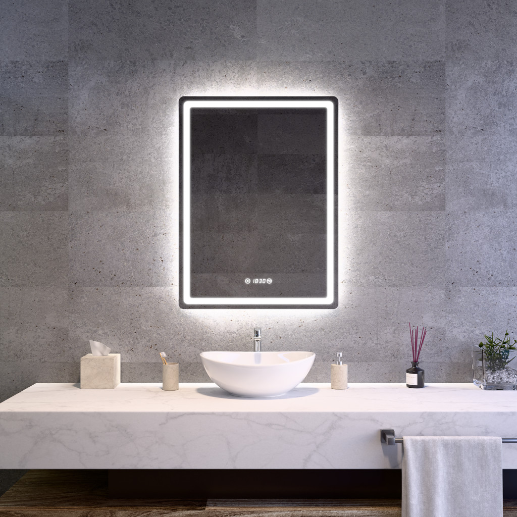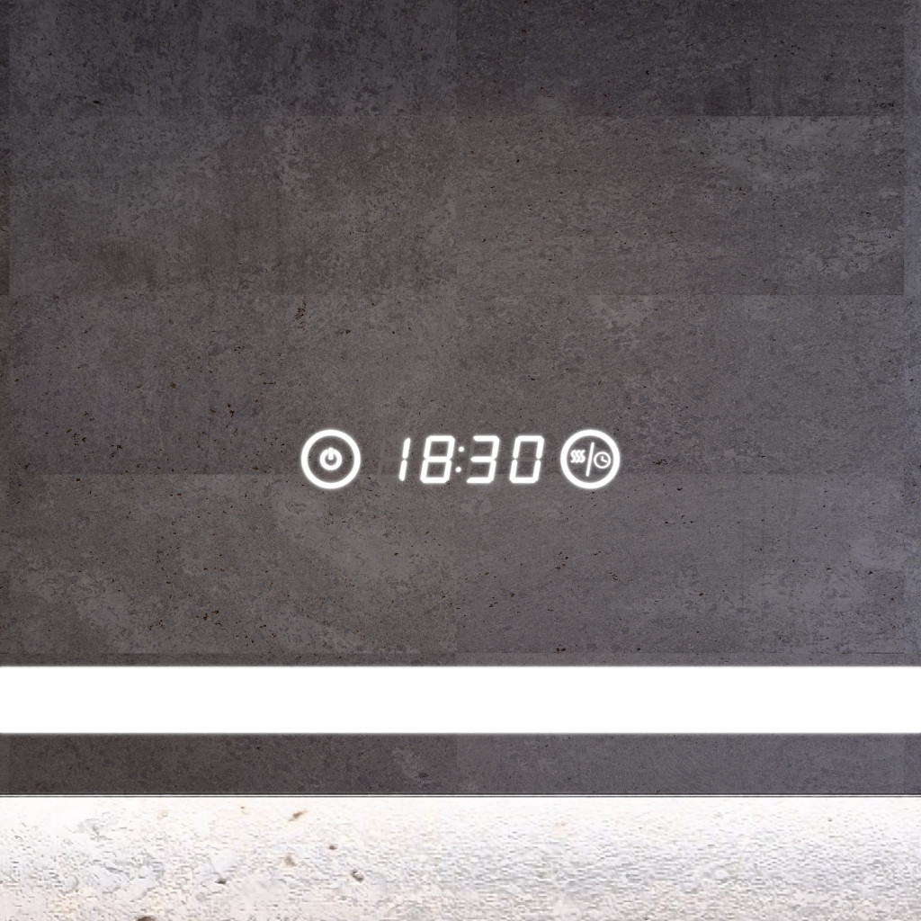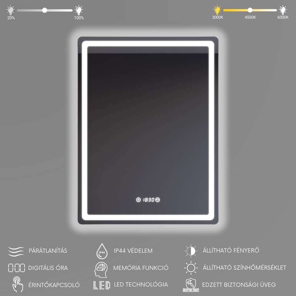 Digitális óra és hőmérséklet kijelzés: A tükör felületén egy digitális óra található, ami praktikus a reggeli készülődés során. Az óra felváltva mutatja az időt és az aktuális hőmérsékletet.