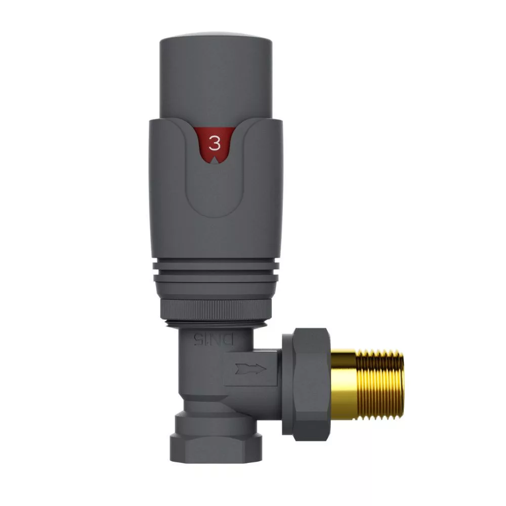 Radiátor sarokszelep szett törölközőszárító és design radiátorokhoz szürke színben. A készlet tartalmazza a radiátor előremenő és visszatérő ágakhoz felszerelhető 2 db szelepet.