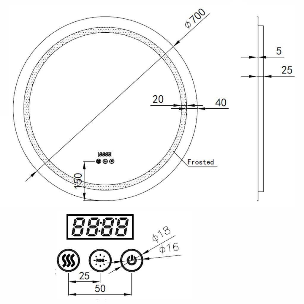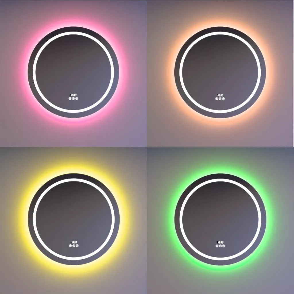 - A tükör hátlapja mögötti keretbe integrált RGB LED szalag oldal irányba vetíti ki a fényt, 8 szín - fehéret is beleértve - közül választhatunk. Ezen kívül többféle színes futófény és színenként automatikusan váltakozó program közül választhatunk.