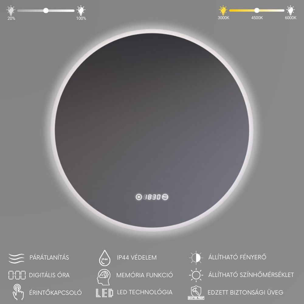 Páramentesítő funkció: érintőgombos kapcsolható páramentesítő funkció található a tükör felületén, 9W teljesítménnyel, ami gyors páraeltávolítást biztosít.