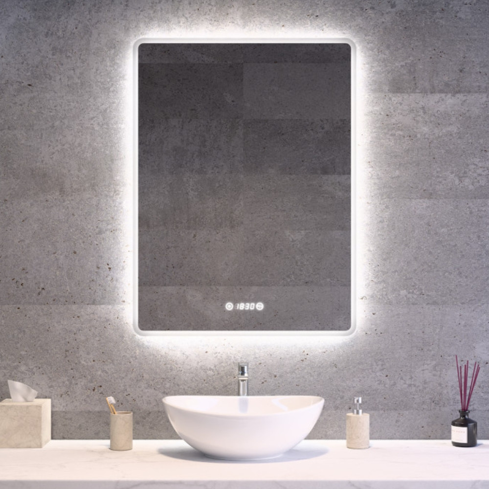 Digitális óra és hőmérséklet kijelzés: A tükör felületén egy digitális óra található, ami praktikus a reggeli készülődés során. Az óra felváltva mutatja az időt és az aktuális hőmérsékletet.