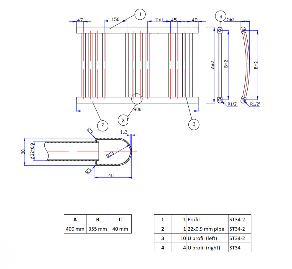 Vízszintes cső keresztmetszet/átmérő: 22 mm